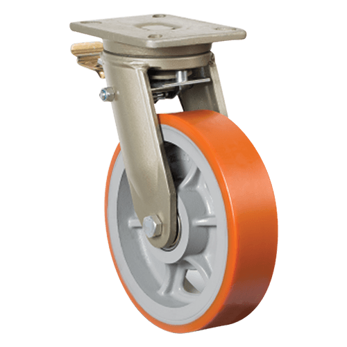 Поворотное большегрузное колесо EMES Большегрузное полиуретановое колесо EV 01 VBP 200F-50 диаметром 200 мм — оптимальный вариант для установки на большегрузное складское и строительное оборудование и платформенные тележки. Шинка изготовлена из полиуретана, обод — из высокопрочного чугуна, кронштейн — из оцинкованной стали, устойчивой от коррозии. Предусмотрено наличие тормоза-педали.