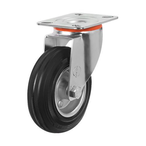 Грузоподъемность поворотного промышленного колеса EM01SPR100 составляет 75 кг, диаметр — 100 мм. Контактный слой изготовлен из литой черной резины, обод и кронштейн — из оцинкованной стали. Роликовый подшипник в оси обладает высокой стойкостью к радиальным нагрузкам, двойной шариковый подшипник в поворотном узле обеспечивает легкость маневрирования, защищен пылевлагозащитным кольцом.