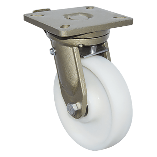 Данная большегрузная колесная опора выдерживает нагрузку до 600 кг. Кронштейн выполнен из прочной стали и имеет антикоррозионное покрытие, а само колесо — из цельнолитого нейлона, обладающего высокой устойчивостью к износу. Поворотный узел обеспечивает удобное изменение направления движения. Наличие тормозного механизма позволяет надежно фиксировать колесо в нужном положении во время остановки, предотвращая его самопроизвольное вращение и повышая безопасность при работе с грузами.