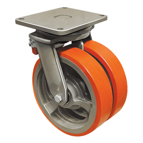 Сдвоенное колесо с ножным тормозом EMES EW01 VBP 200 F имеет диаметр 200 мм, способно выдерживать супернагрузки — максимальная грузоподъемность составляет 2200 кг. Модель станет отличным выбором для установки на тяжелое складское, промышленное и строительное оборудование, платформенные тележки.
