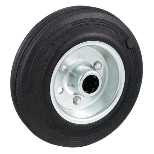 Колесо промышленное из черной резины. Жесткость 80 шор А. Центр-сердечник состоит из двух гальванизированных дисков, соединённый прочными заклепками. Все элементы выполнены из высококачественной стали. Роликовый подшипник расположен в углублении, выдавленном под прессом, и содержит цилиндрические ролики подшипника в обойме из полиамида 6. Эта серия широко используется, с любыми тележками и контейнерами, легкой и стандартной грузоподъемности, для строительных лесов, а также для работы вне помещений. Применение: тележки для внутренних и внешних работ на складах и в промышленности, багажные тележки, для строительных лесов, контейнеры для мусора, электрооборудование. Поверхности перемещения: для полов, практически любого типа, даже вне крытых помещений. Позволяют легко преодолеть препятствия, не наносят урон хрупким напольным покрытиям. Температурный диапазон эксплуатации от -20 до +60С. Рекомендуемые опоры: SL, NL, NLX.