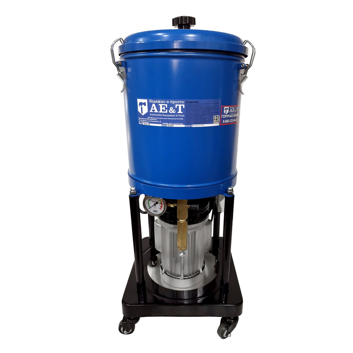 Солидолонагнетатель оснащен четырьмя колесами (диаметр 2"), два из которых поворотные, что дает возможность передвигать устройство по рабочему пространству. Большой легкочитаемый манометр позволяет контролировать процесс нагнетания солидола. В комплекте также предусмотрен раздаточный пистолет.