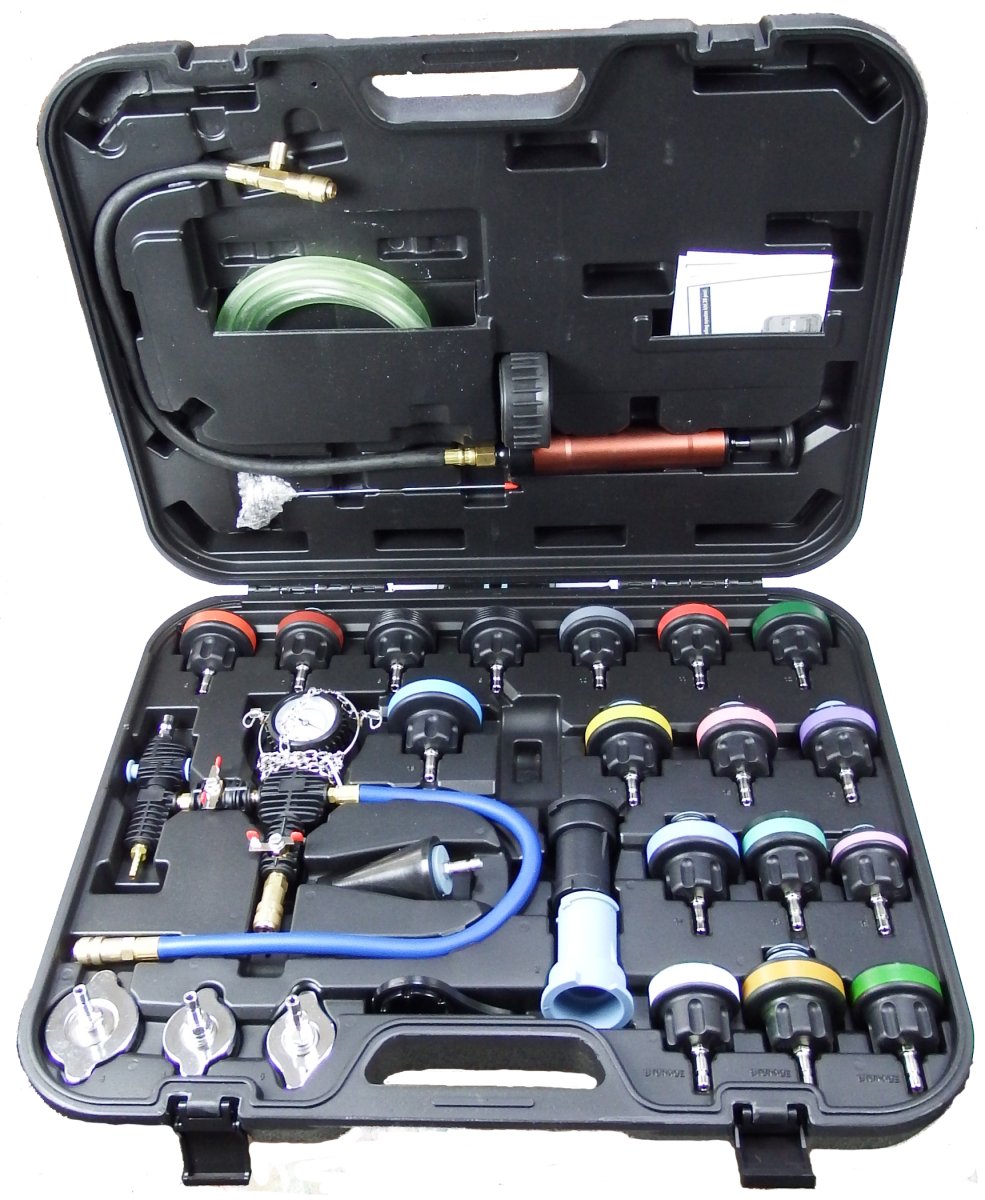 Опрессовка TA-G1025 пригодится мастеру-профессионалу при диагностике и ремонте системы охлаждения. В наборе множество адаптеров под практически все существующие стандарты соединений — 14 шт, а также насос с манометром.