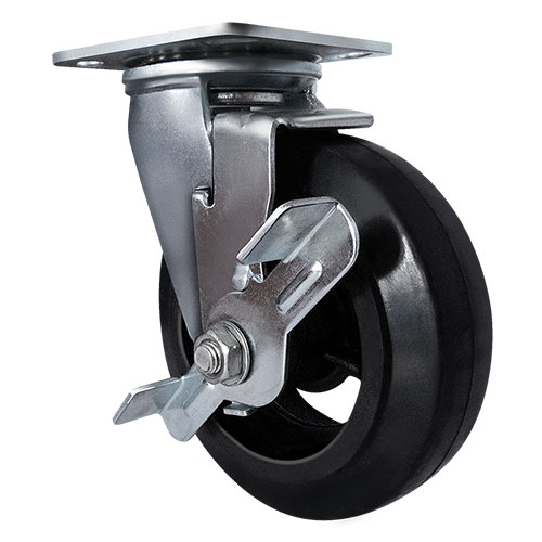 Колесо большегрузное обрезиненное поворотное с тормозом SCDB63 предназначено для строительного, коммунального и складского оборудования. Шинка выполнена из термопластичной черной резины. Материал отличается высокой износостойкостью и сопротивляемостью к неблагоприятным воздействиям внешней среды. Колесо не требовательно к качеству напольного и дорожного покрытия. Обод выполнен из чугуна и оснащен смазочным ниппелем. В оси установлен роликовый подшипник. В поворотном механизме установлен двухрядный шариковый подшипник с пресс-масленкой. Кронштейн — сварной, изготовлен из оцинкованной листовой стали. Диапазон температур — от -35ºC до +50ºC.