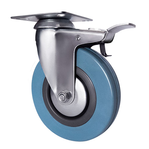 Колесо аппаратное поворотное с тормозом SCgb 93 предназначено для легкого торгового, лабораторного, медицинского, гостиничного, офисного и складского оборудования. Шинка выполнена из термопластичной серой резины. В оси установлен подшипник скольжения. Кронштейн с платформенным типом креплением изготовлен из оцинкованной стали. Полипропиленовый обод закрыт стальными кожухами. Не оставляет следов на напольных покрытиях. Отличается хорошими ходовыми качествами, повышенной маневренностью, низким уровнем шума, устойчивостью к внешним химическим воздействиям. Диапазон температур — от -35ºC до +60ºC.