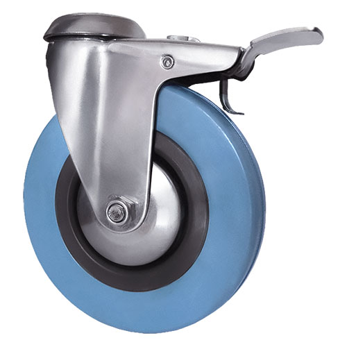 Колесо аппаратное поворотное под болт с тормозом SChgb 42 предназначено для легкого торгового, лабораторного, медицинского, гостиничного, офисного и складского оборудования. Шинка выполнена из термопластичной серой резины. В оси установлен подшипник скольжения. Кронштейн с креплением «под болт» изготовлен из оцинкованной стали. Полипропиленовый обод закрыт стальными кожухами. Не оставляет следов на напольных покрытиях. Отличается хорошими ходовыми качествами, повышенной маневренностью, низким уровнем шума, устойчивостью к внешним химическим воздействиям. Диапазон температур — от -35ºC до +60ºC.