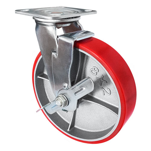 Колесо большегрузное полиуретановое поворотное с тормозом SCPB55 предназначено для оснащения складского, транспортного строительного оборудования и тяжелых механизмов. Шинка выполнена из полиуретана. Материал отличается высокой износостойкостью и большой грузоподъемностью. Колесо отлично переносит динамические, статические и ударные нагрузки, хорошо служит на любых твердых поверхностях. Обод выполнен из чугуна, оснащен роликовым подшипником в оси и смазочным ниппелем. В поворотном механизме установлен двухрядный шариковый подшипник с пресс-масленкой. Кронштейн — сварной, изготовлен из оцинкованной листовой стали. Диапазон температур — от -35ºC до +50ºC.