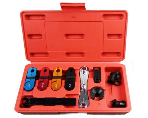 - Богатая комплектация: 4 разъединителя из анодированного алюминия размерами 1/4 дюйма, 5/16 дюйма, 3/8 дюйма, ½ дюйма; 2 разъединителя типа «ножницы» 5/16 и 3/8 дюйма соответственно, продолговатый съемник 1/2 дюйма, круглый съемник 1/2 дюйма, 2-точечный съемник, уплотнители из резины – четыре шт.