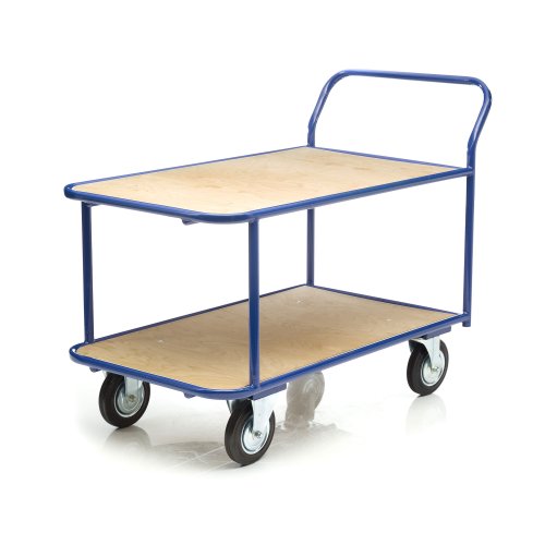 Платформенная двухъярусная 4-х колесная тележка КП-2-Ф-5-8-150-И используется для перевозки малогабаритных грузов. Платформы имеют металлический каркас накрытый фанерой толщиной 10мм., размер платформы 500х800мм., расстояние между ярусами 480мм., количество ярусов 2 шт, габаритная высота 1050мм. Покрытие металлических деталей тележки полимерное, цвет - синий. Тележка широко используется на складах, в торговых павильонах, а также в гостиничном и ресторанном бизнесе. Две платформы позволяют удобно расположить перевозимые предметы. Тележка комплектуется двумя поворотными и двумя неповоротными колесами, диаметром 150мм., изготовленными из высококачественной литой резины, комплектом крепежа. Грузоподъемность до 450кг.