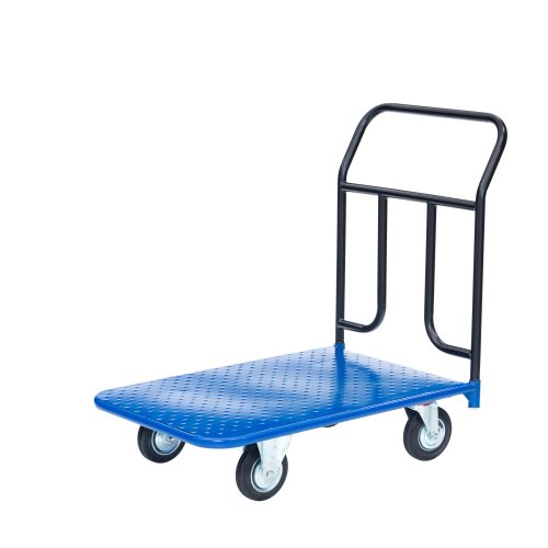 Платформенная 4-х колесная тележка КП-300-125-И используется для перемещения различных грузов в складских помещениях. Ручка крепится к платформе болтами, для компактного хранения можно снять, высота ручки 750мм. Платформа имеет уникальную рельефную, полимерную, противоскользящую поверхность, размером 600х900мм. Цвет - синий, шагрень. Тележка комплектуется: метизами для крепления, двумя поворотными и двумя неповоротными промышленными колесами, диаметром 125мм., из черной стандартной резины, от всемирно известного, ведущего итальянского производителя Tellure Rota. Грузоподъемность до 390кг.