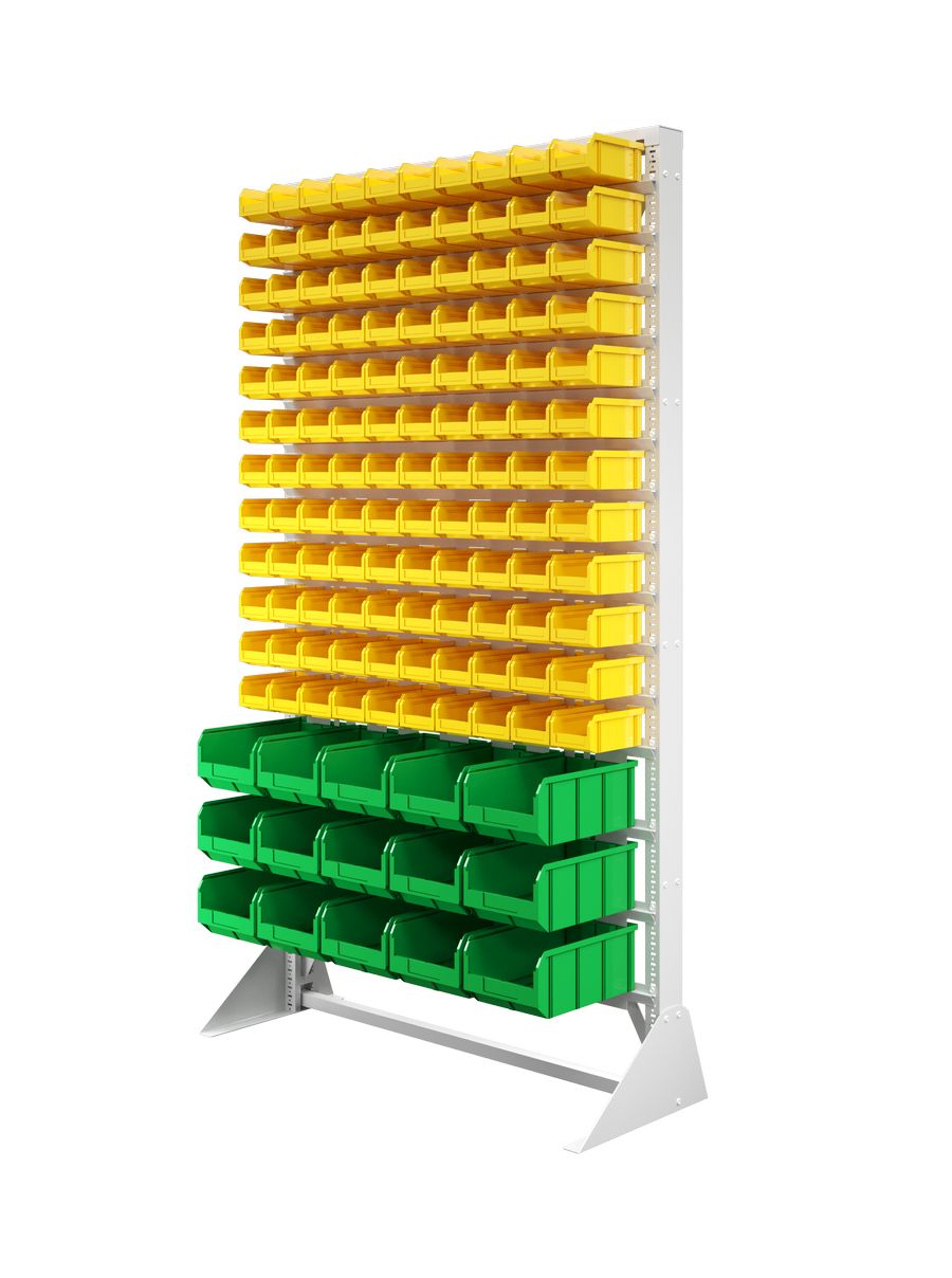 Стойка 1150х2000 Стелла-техник В1-12-00-03 односторонняя служит для эффективной организации рабочего пространства склада, магазина, гаража, мастерской. Используется для систематизации и хранения мелких подручных приспособлений и инструментов. Опоры стойки 1150х2000 имеют возможность крепления к полу, что обеспечивает высокую устойчивость всей конструкции. Стойка оснащена ящиками различной вместимости, в количестве 135 штук, в каждом из которых предусмотрен специальный кармашек для опознавательной карточки - это позволяет эффективно систематизировать помещенные туда инструменты и приспособления. Сборка данной конструкции не требует от пользователя каких-либо специальных знаний и умений. Стойка не займет много места в авто-слесарной мастерской, на складе или в торговом помещении. Комплектация: Стойка под пластиковые ящики 1150х2000мм. без опоры, серия К; Опора стойки односторонняя комплект (правая + левая + крепеж) серия К; Держатель для стойки 1150мм., серый, распределенная нагрузка до 40кг. на ряд, серия К - 15 шт.; Пластиковый ящик серии V-1, размер 172х102х75мм. - 120 шт.; Пластиковый ящик серии V-3, размер 341х207х143мм. - 15 шт.; Упаковка. Преимущества: Хороший визуальный обзор содержимого. Каждый ящик оснащен специальным кармашком, позволяющим вставить этикетку для индикации содержимого. Конструкция стойки позволяет легко извлекать нужный ящик и так же легко устанавливать его на место. Быстрая сборка. Высокая прочность. Габариты: 1150х330х2000мм., вес 56кг.